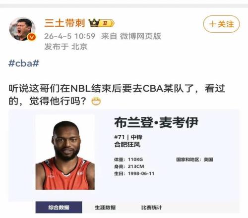 麦考伊身高2.13米,体重110公斤,本赛季效力合肥狂风,常规赛场均得到17.4分11.1篮板1.7盖帽,是球队的内线支柱。麦考伊是典型的蓝领大外,能护框能抢板,吃饼能力也很强,与后卫打挡拆配合的意愿也高,可以说是市面上最适合广东的大外援了。加上麦考伊现在打的是NBL联赛,身价肯定不高,适合已经花完外援预算的广东。非常期待麦考尔加盟宏远后,与徐杰打一五挡拆,重现上赛季徐杰和莫兰德的完美配合!