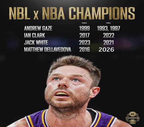 此前三个是马刺旧将安德鲁-盖茨,勇士旧将伊恩-克拉克和掘金旧将杰克-怀特。德拉维多瓦2016年在NBA夺冠,2026年在NBL夺冠。盖茨1993年和1997年在NBL夺冠,1999年在NBA夺冠。克拉克2017年在NBA夺冠,2022年在NBL夺冠。