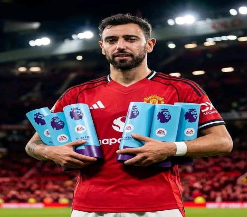 曼联周一飞赴爱尔兰的都柏林进行集训,队长布鲁诺·费尔南德斯同时获得了英超3月最佳和俱乐部3月最佳球员的称号,上个月他4场比赛打入2球、助攻4次。B费拿着两个奖杯拍摄了照片,红魔官网开玩笑说,布鲁诺加的荣誉柜已经放不下他的个人奖项了。
